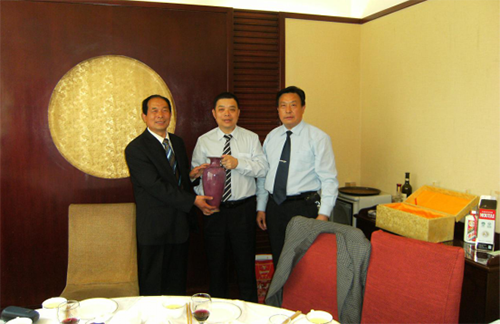 二00六年十月,河南嵩山甄氏文化研究会,迎接侨居美国的甄润海、甄肇真等宗亲一行寻根联谊代表团到河南。丰瑞知道后非常重视。他自己慷慨解囊,出资数万元多次赴神垕大宋官窑,与钧瓷专家商量定造型和底款,最终决定烧造“观音瓶”型,底款落“大宋官窑荣昌钧瓷坊・豫甄”字款。在制作和烧制过程中,他很是关心,他要求师傅专门为中外甄氏族人烧制出精品钧瓷宝瓶,他亲自从两窑中挑选出了五十多件珍品。在中美联谊大会上,他亲自赠给美国甄氏宗亲每人一个宝瓶。旅美的甄润海等宗亲说:“河南的宗亲真是热情,赠送了这么珍贵的礼物,我们回去后将世世代代好好收藏。”同时,他还先后分向参会的甄氏宗亲赠送了造型奇特,开片精美的钧瓷宝瓶。